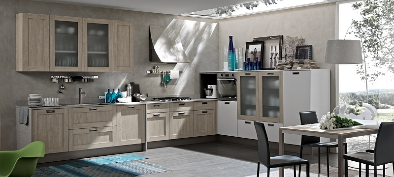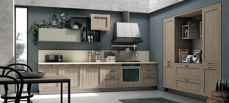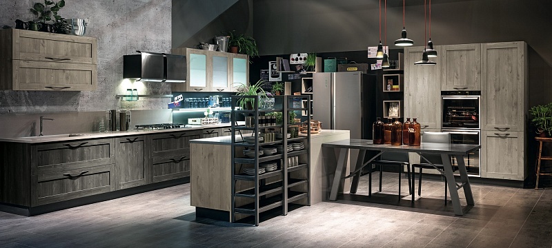 Добро пожаловать на новую кухню City, вдохновение, черпаемое от винтажа: дизайн прошлого, интерпретируемый в современном ключе для создания необычного и креативного стиля. Глубокая и решительная эстетика этой кухни способна предложить интересные тактильные и визуальные ощущения. Неровные поверхности в отделке дуб джинс, дуб «бриццо», белый дуб или в песочном цвете сочетаются с предметами меблировки из металла и металлического листа, уникальными вариантами отделками, как, например, «аспидный цемент», которые создают атмосферу «индустриального стиля».
